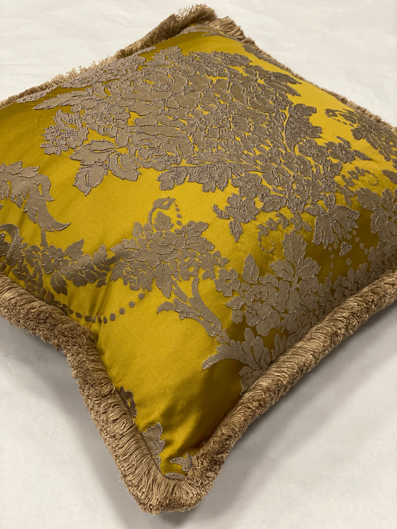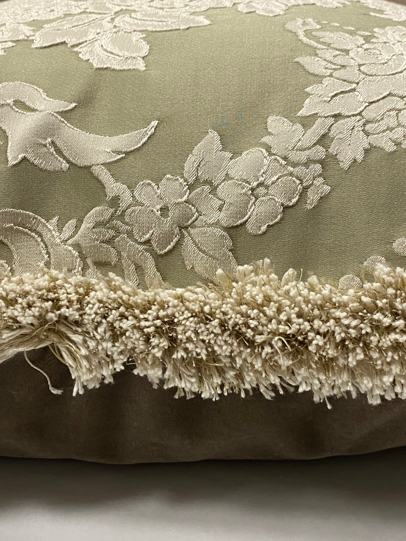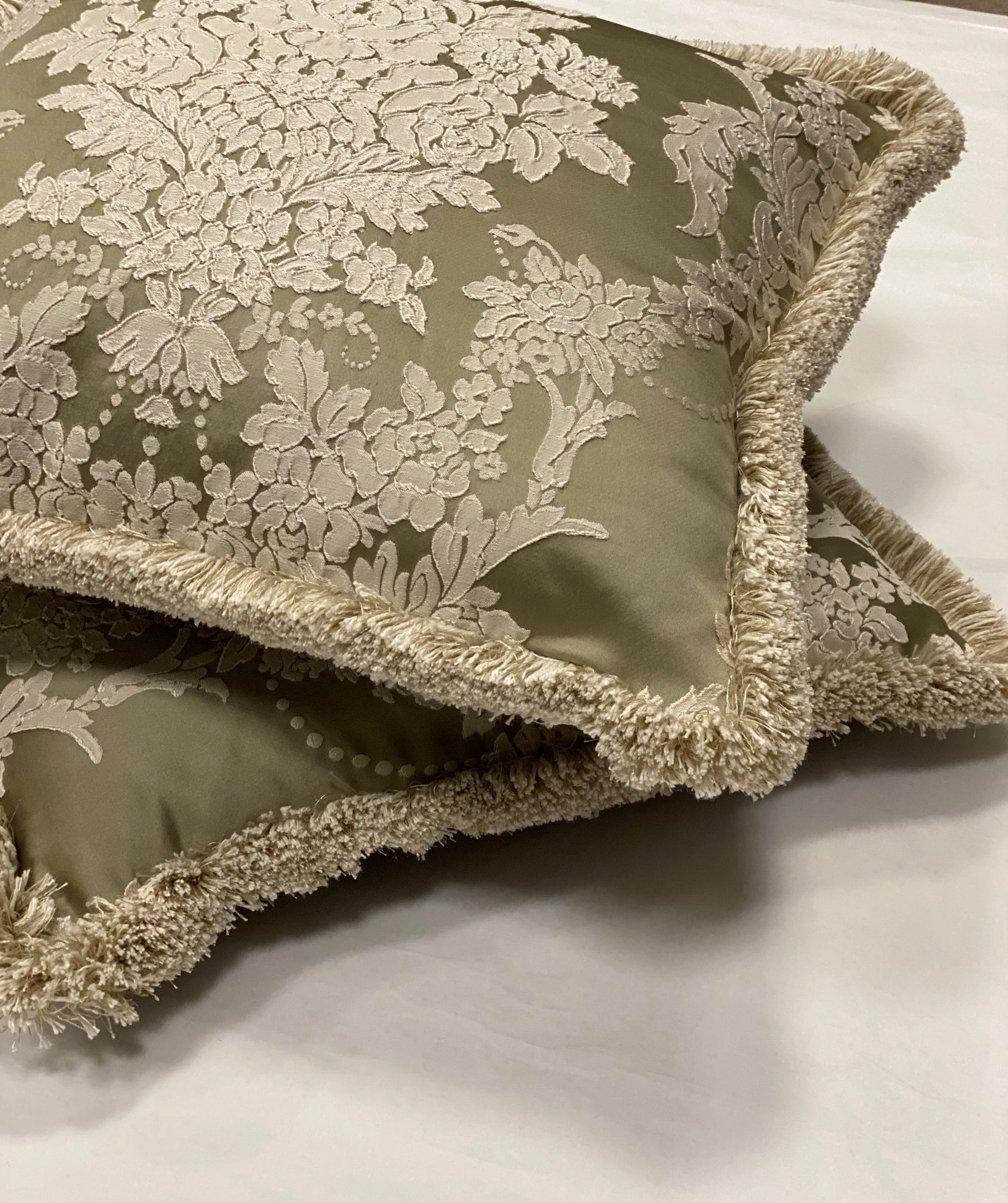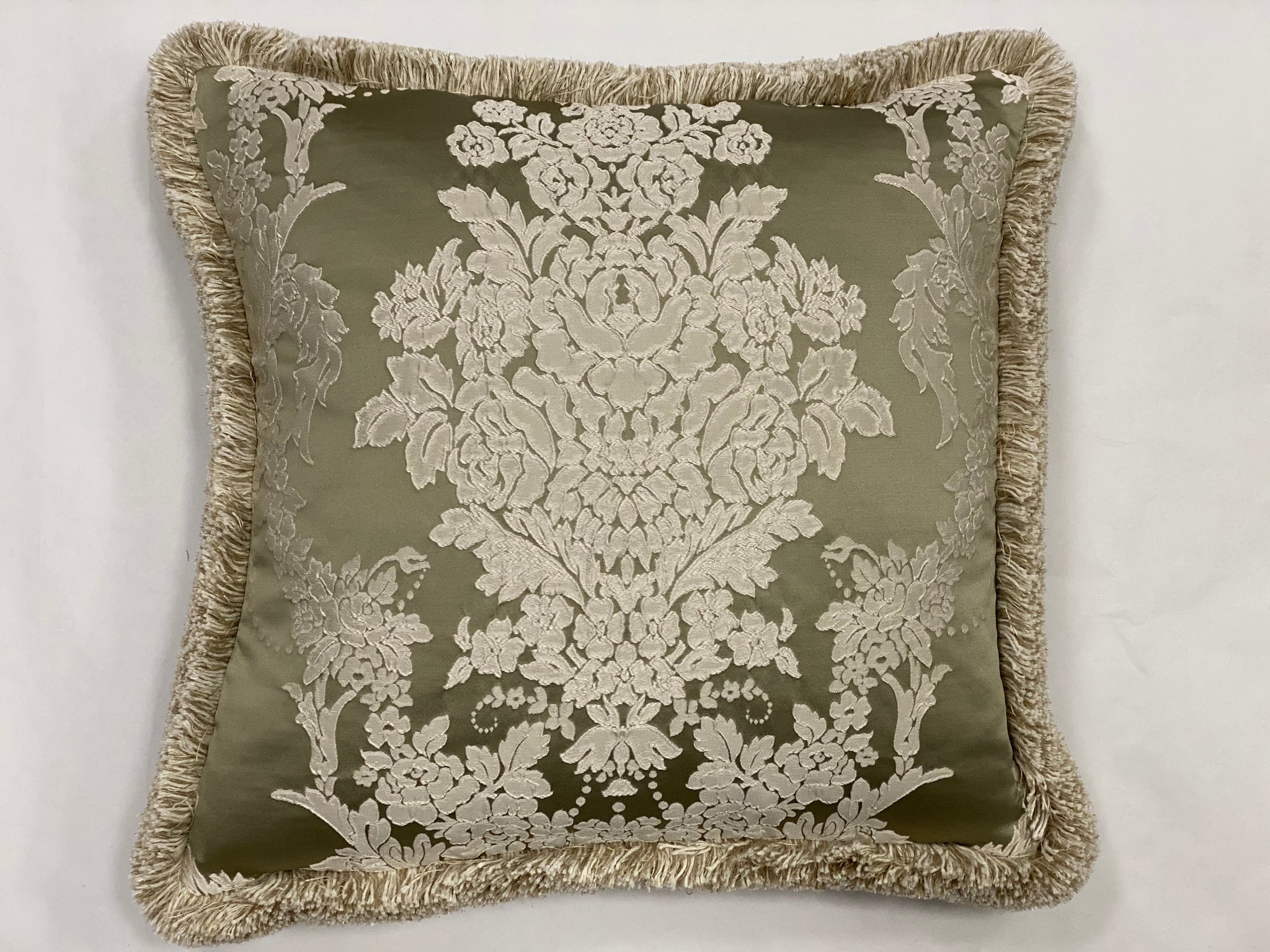 CUSCINO SARTORIALE REALIZZATO CON UN ELEGANTE DAMASCO DOVE LE TRAME SI INTRECCIANO CREANDO UN EFFETTO TRIDIMENSIONALE COME QUELLO DI UN PIZZO SOVRAPPOSTO.