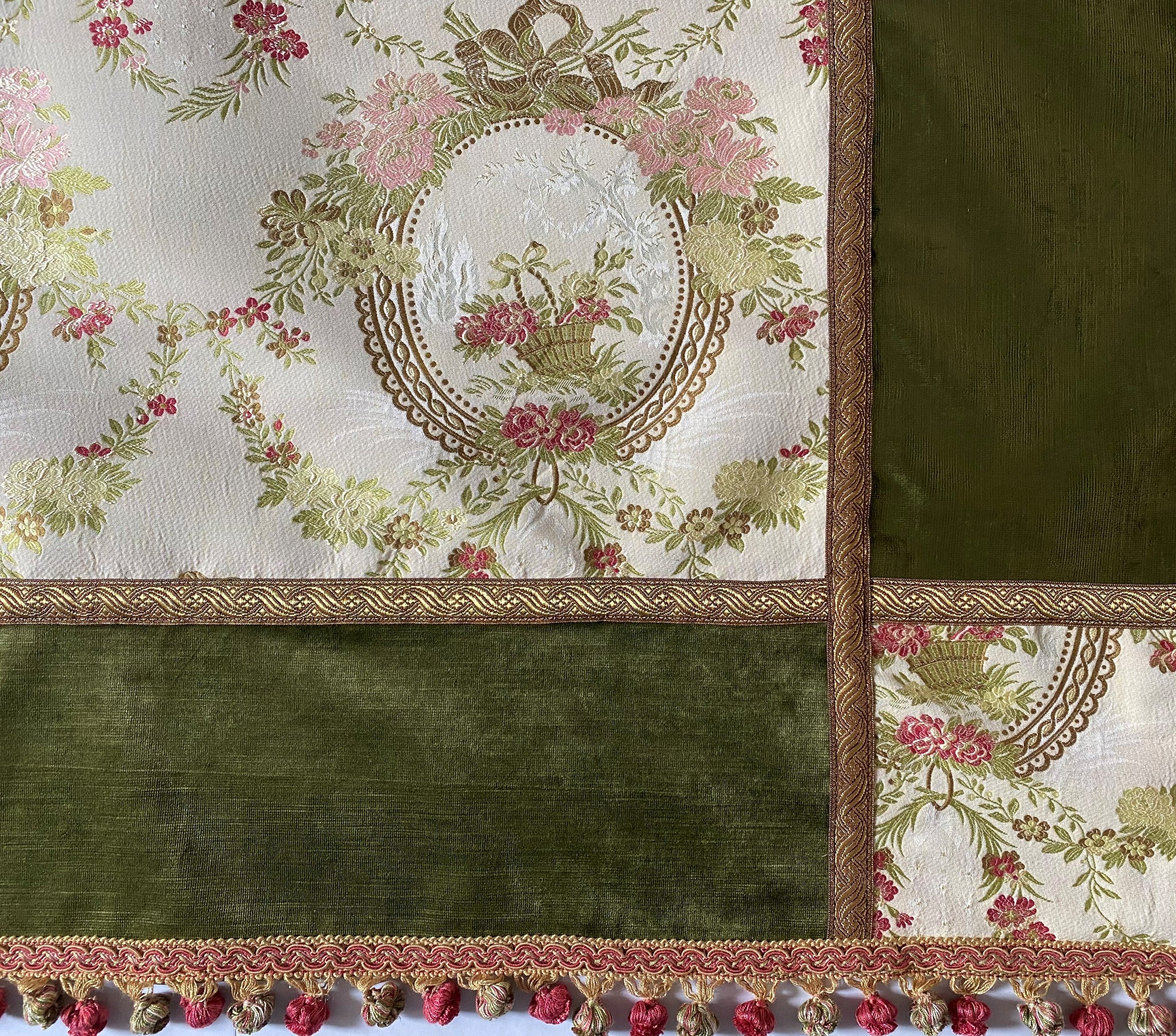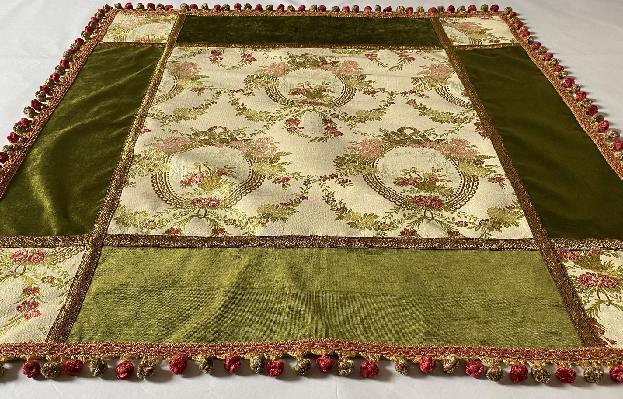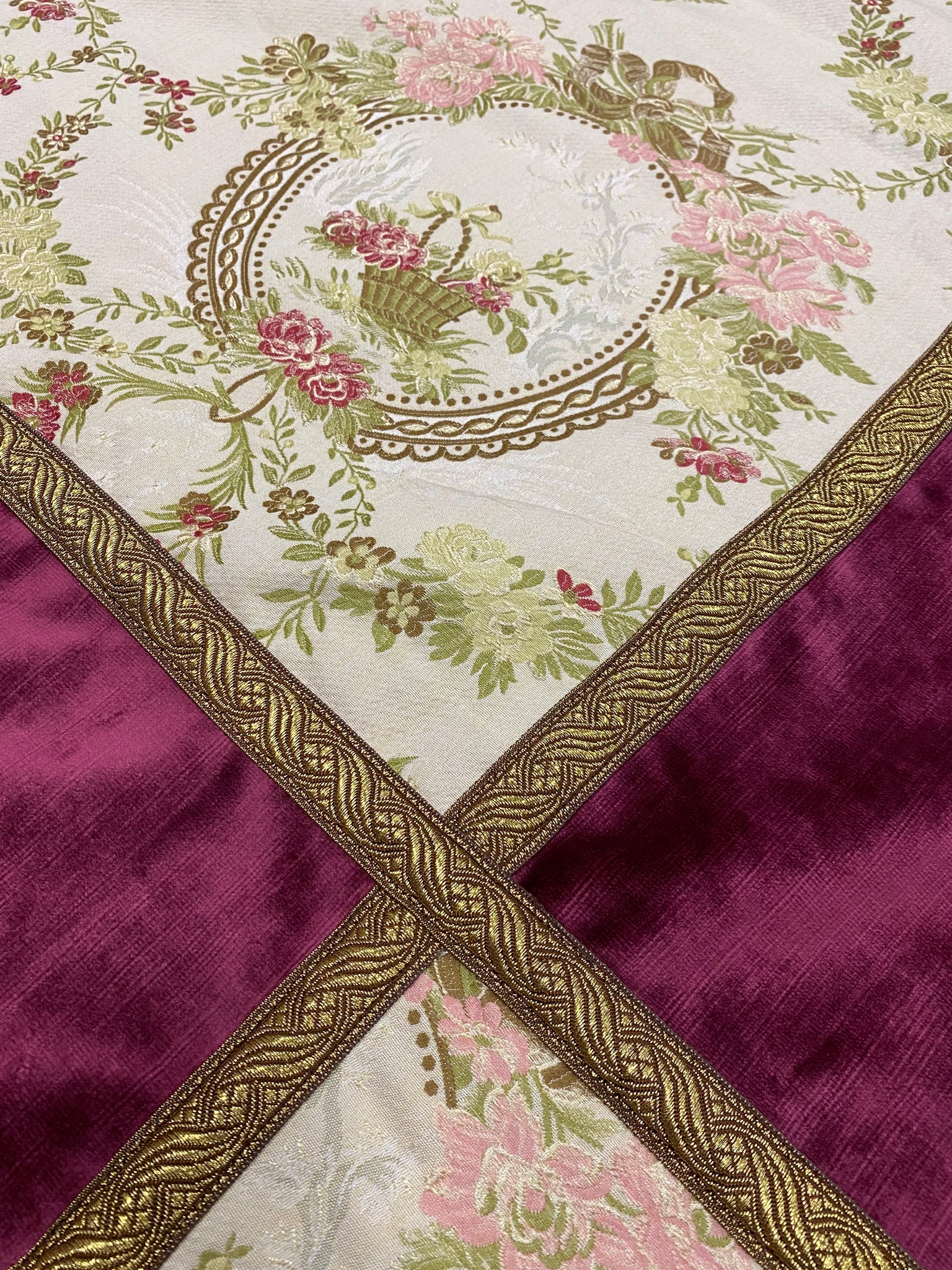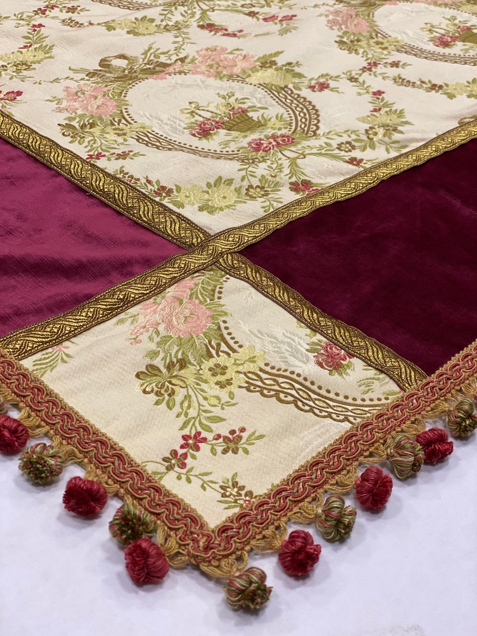 COPRITAVOLO PATCHWORK DELLA COLLEZIONE ROMANCE CON INSERTI IN VELLUTO DI SETA, RIFINITO CON UN PREZIOSO BORDO DORATO E UNA FRANGIA A CIPOLLINE IN TINTA. IMBASTITURA A MANO.