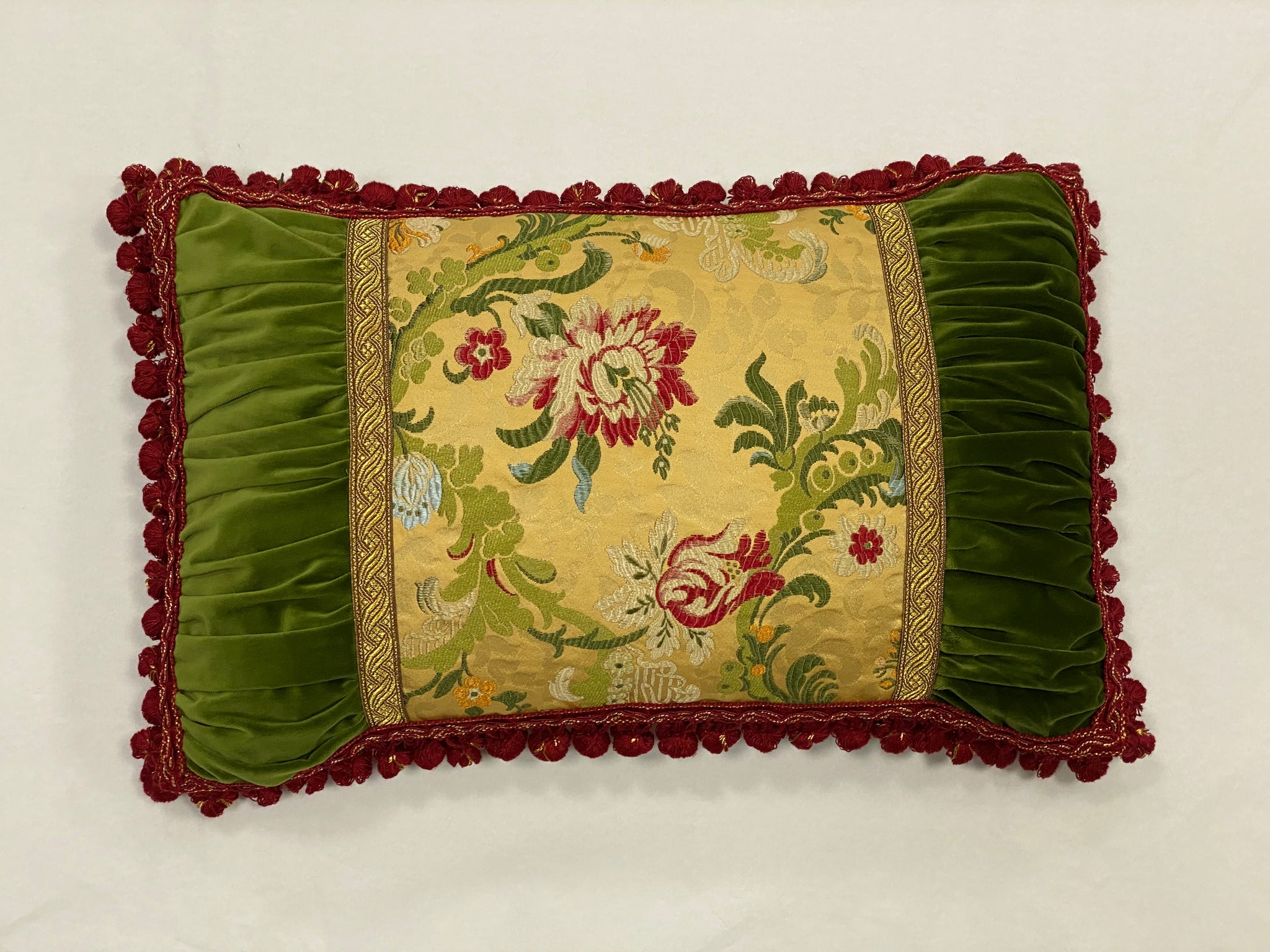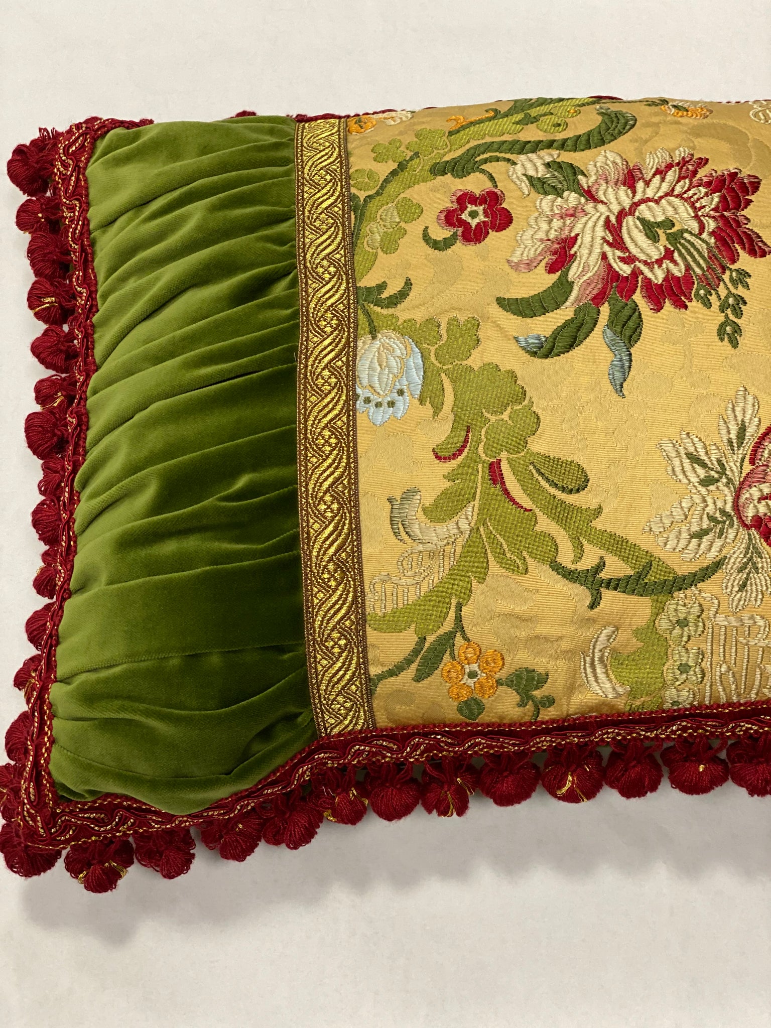 COMPLETA IL CUSCINO UN PREZIOSO BORDO IN ORO ANTICO E LA FRANGIA A CIPOLLINE IN TINTA COL TESSUTO ARRICCHITA DA FILI D'ORO.