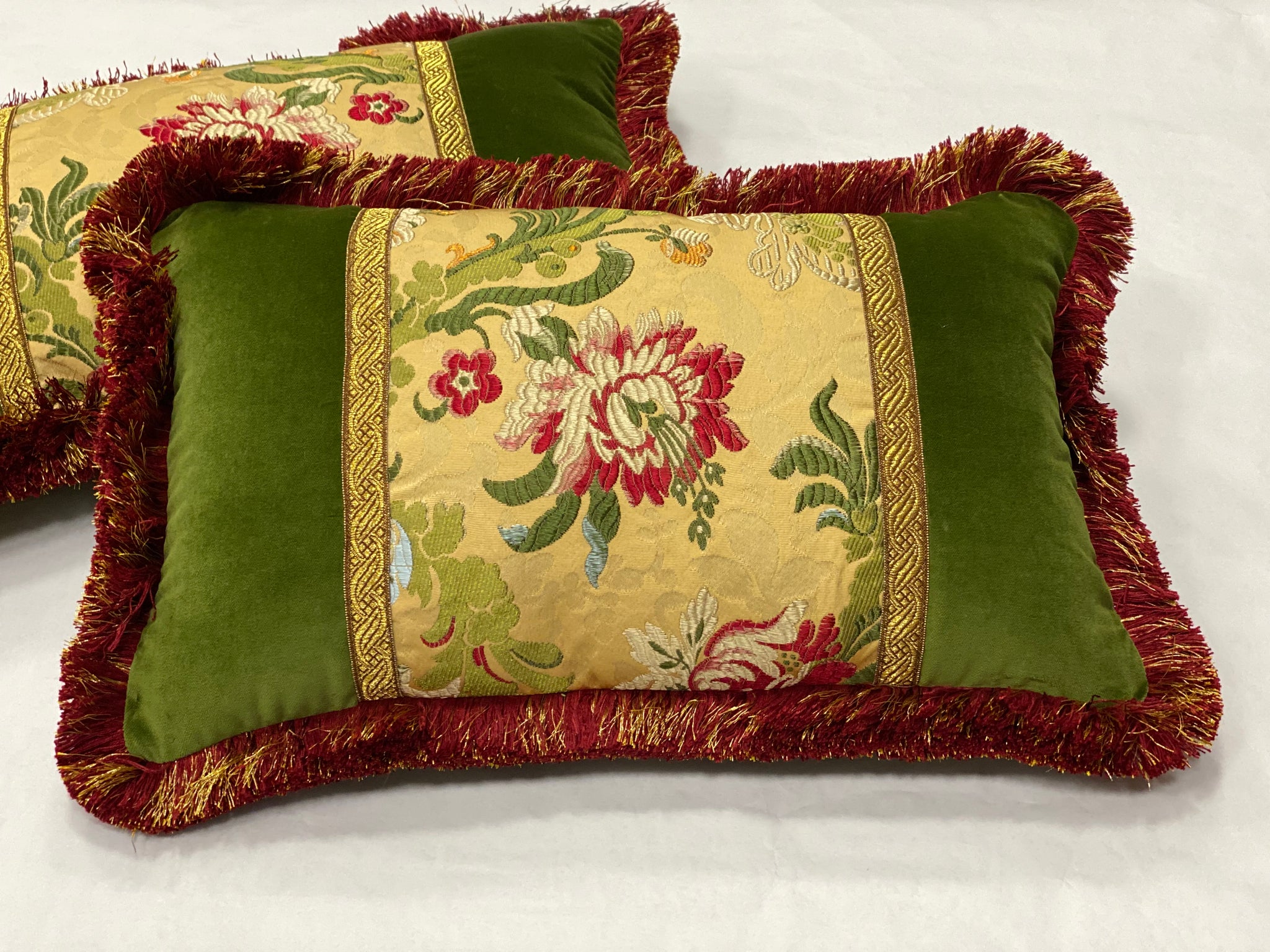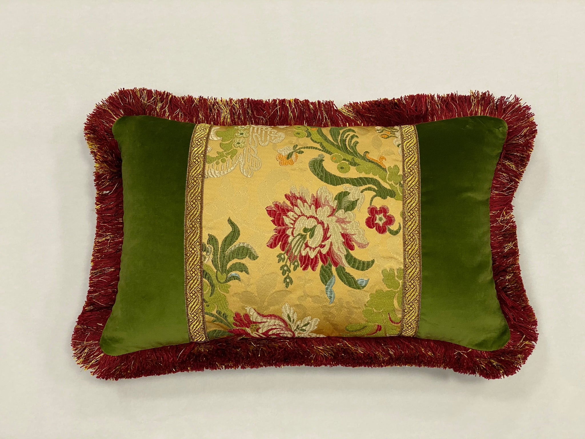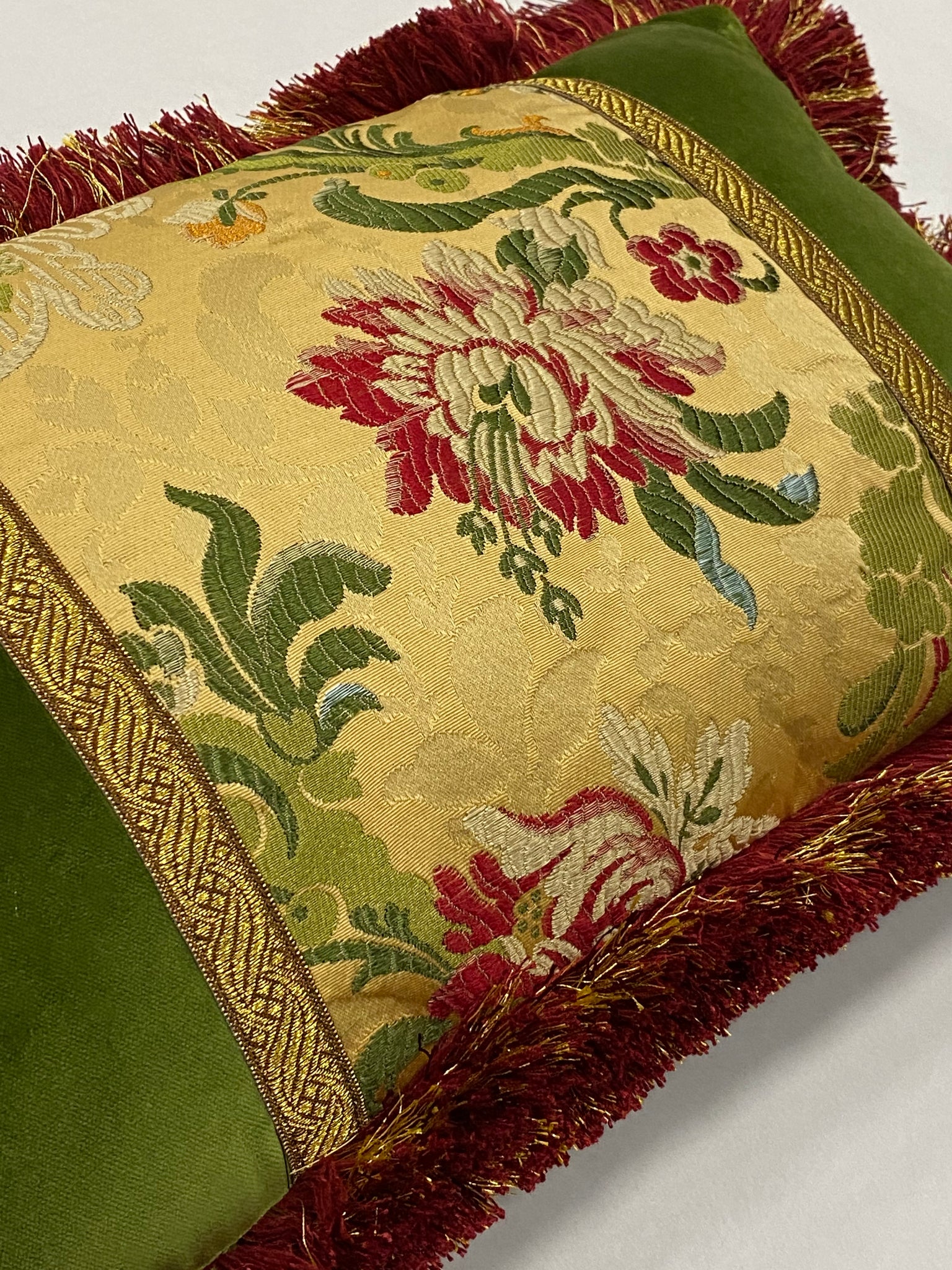 CUSCINO CON INSERTI DI TESSUTO BORBONE ALTERNATI A VELLUTO DI COTONE. IMBASTITURA A MANO. RETRO DELLO STESSO VELLUTO.