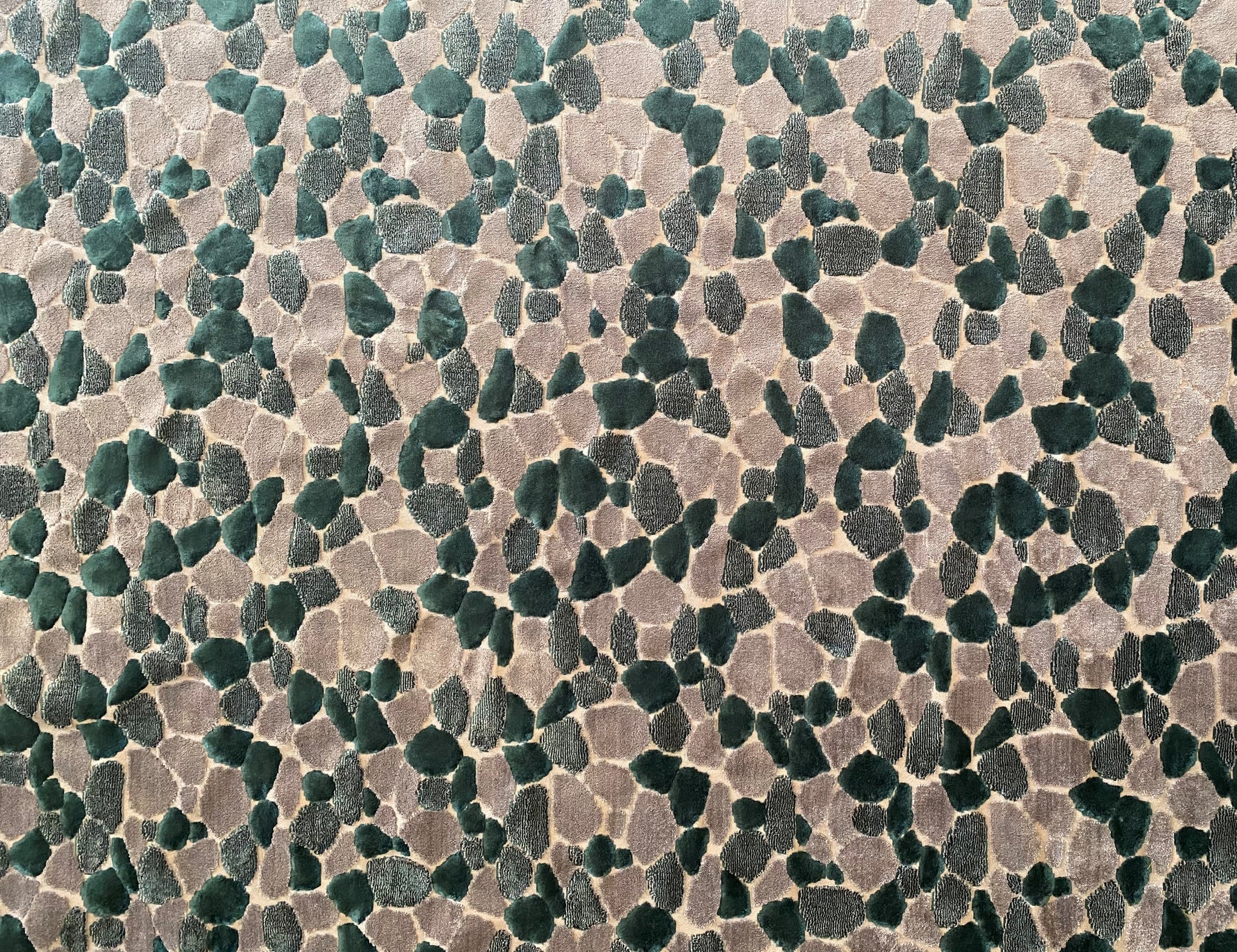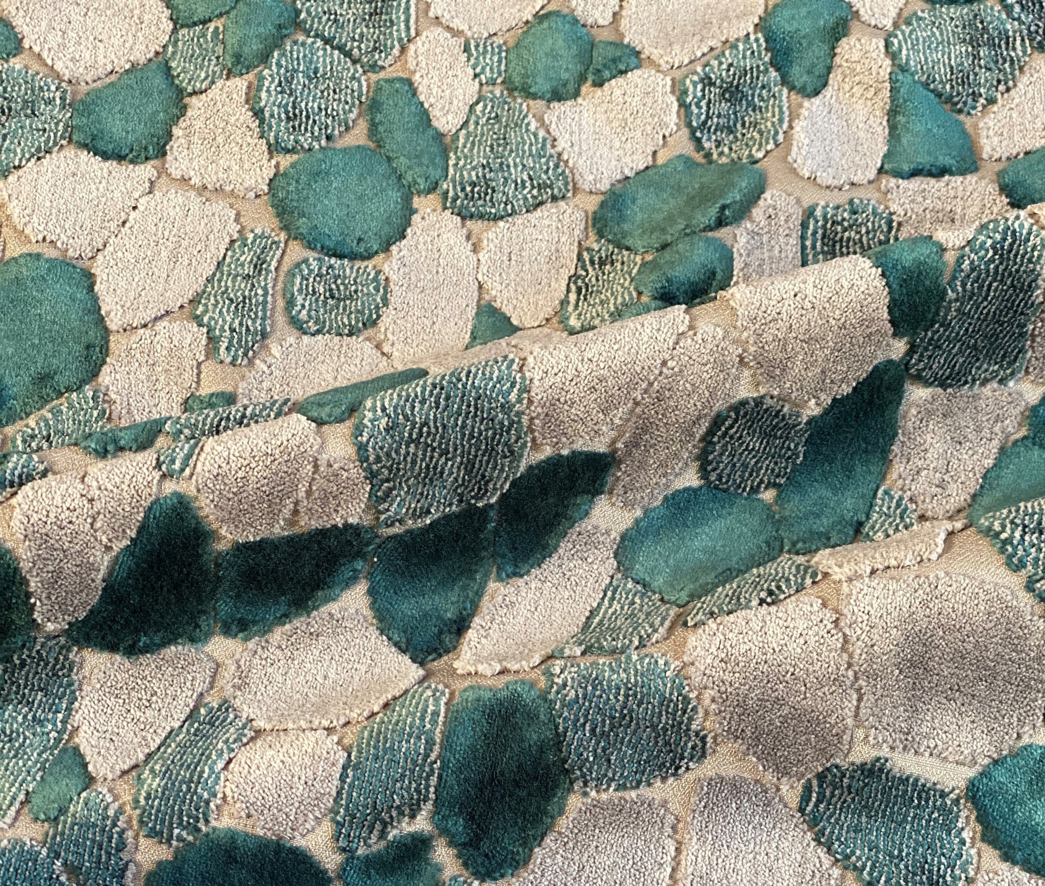 VELLUTO OPERATO SU FONDO TELA. IL DISEGNO PRESENTA DELLE PICCOLE PIETRE CHE SI INCASTRANO COME LE TESSERE DI UN MOSAICO.